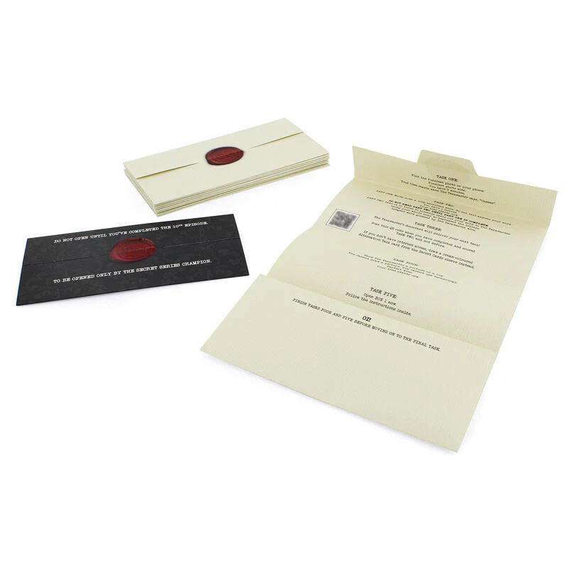 Contents: Sealed task envelopes, Taskmaster art playing pieces, wipe-clean pen, cards in a sleeve, secret boxes, series leader-board chart, rules.